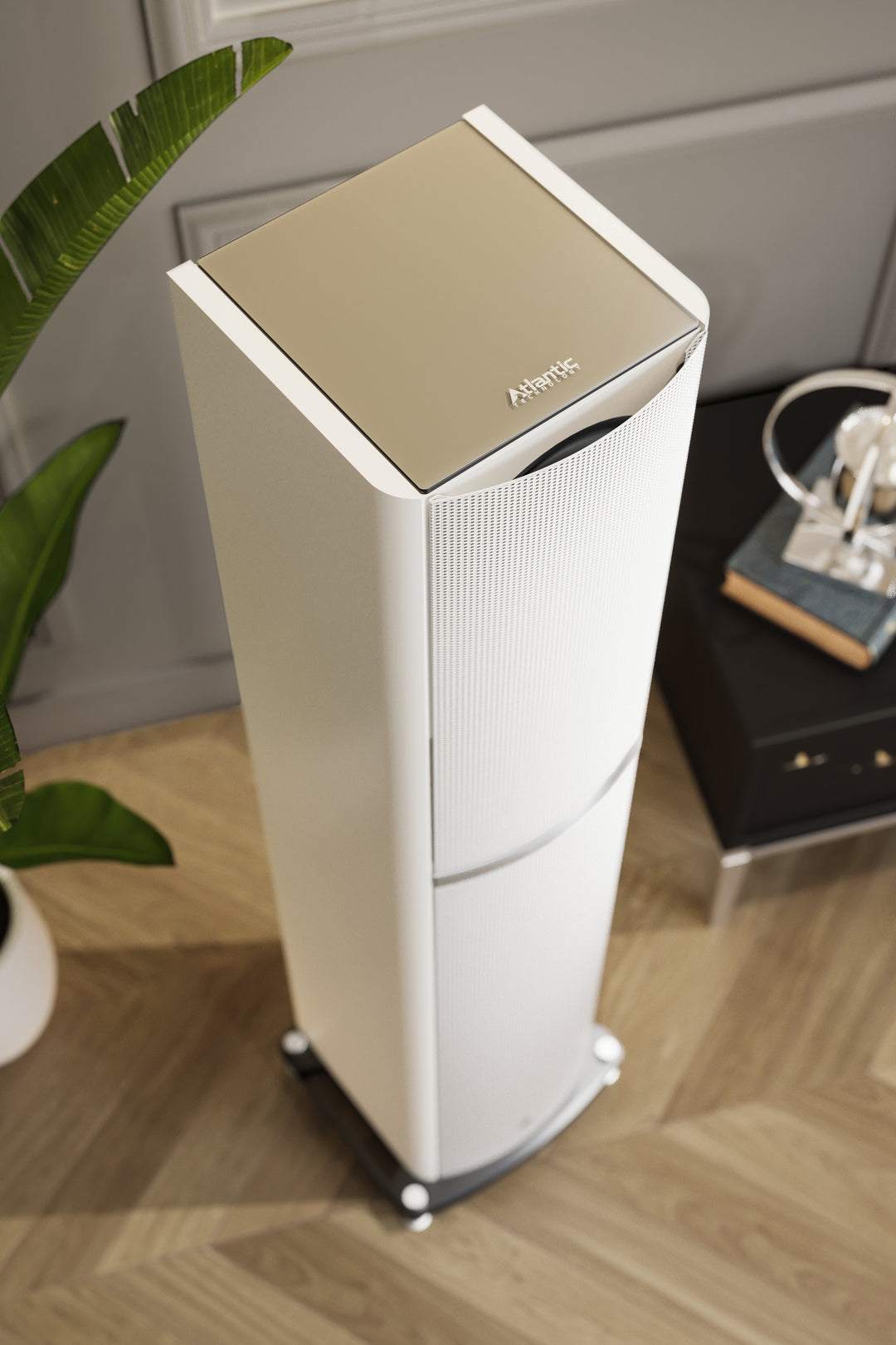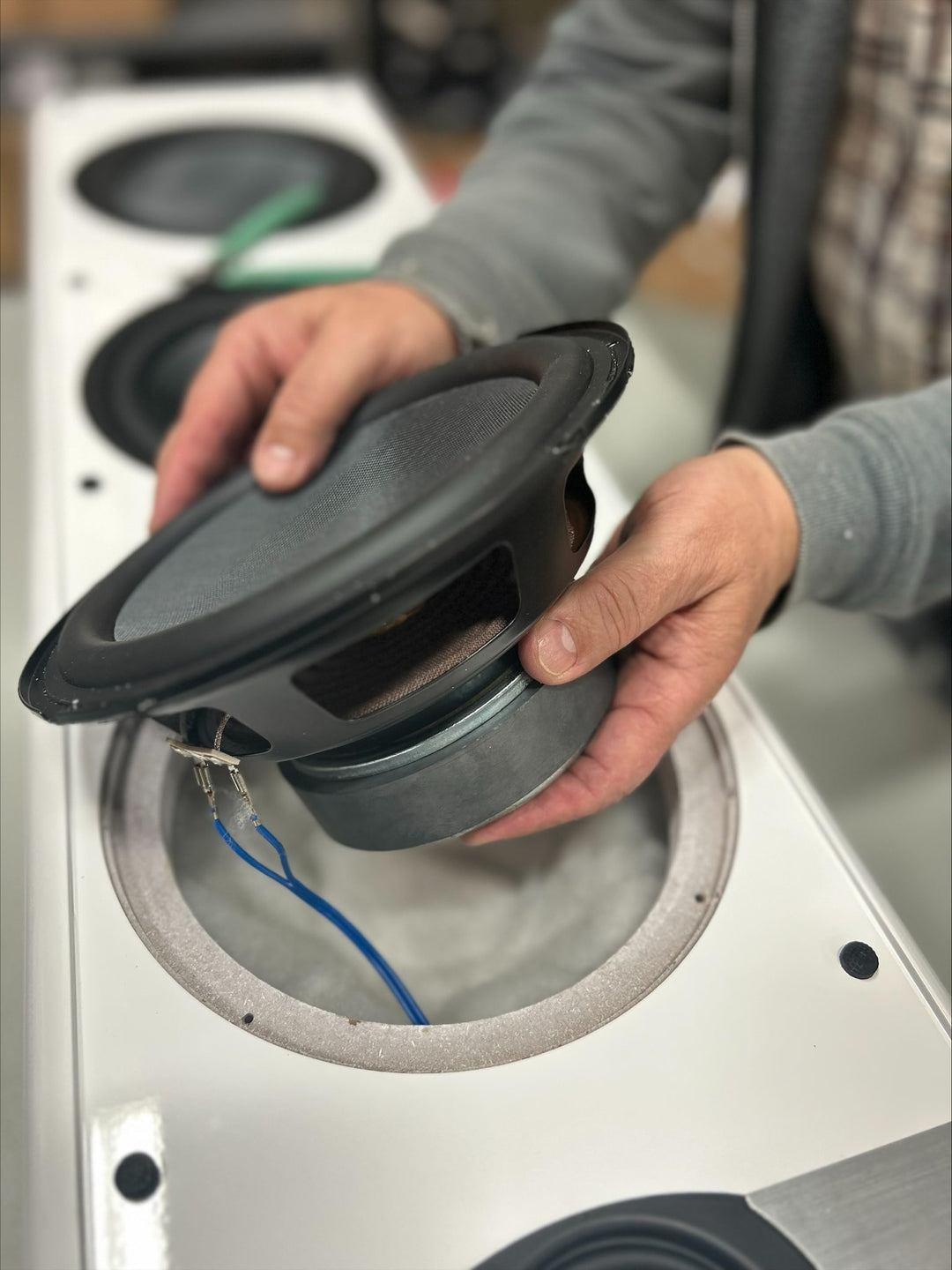 Mid-range and tweeter are set on an aluminum mounting plate, isolating them from the front baffle. This design, tailored to the cabinet's color—aluminum for white, anthracite for black—enhances audio clarity by reducing unwanted resonances.
