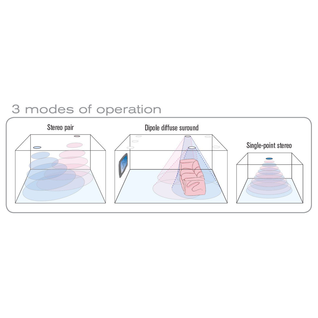The IC-6.3/8.3 offers three unique operating modes. In conventional (mono) mode, the dual voice coil woofer and dual tweeters cover a much wider area than conventional in-ceiling speakers. In single-point stereo mode, the speakers deliver full stereo sound from a single loudspeaker, perfect for distributed audio in tight spaces. In dipole surround (TriVector™ diffuse) mode, the speaker delivers a diffuse upper midrange and high-frequency sound, creating an immersive surround sound experience.